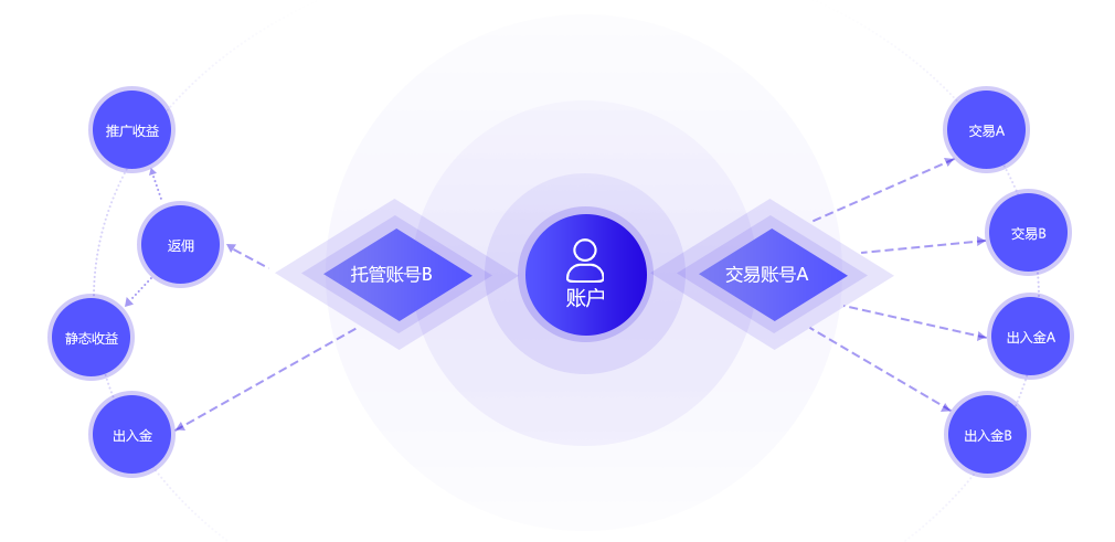 交易账号+托管账号,交易账号只交易,托管账号返佣,包括静态收益和推广收益,两个账号都可以出入金。
